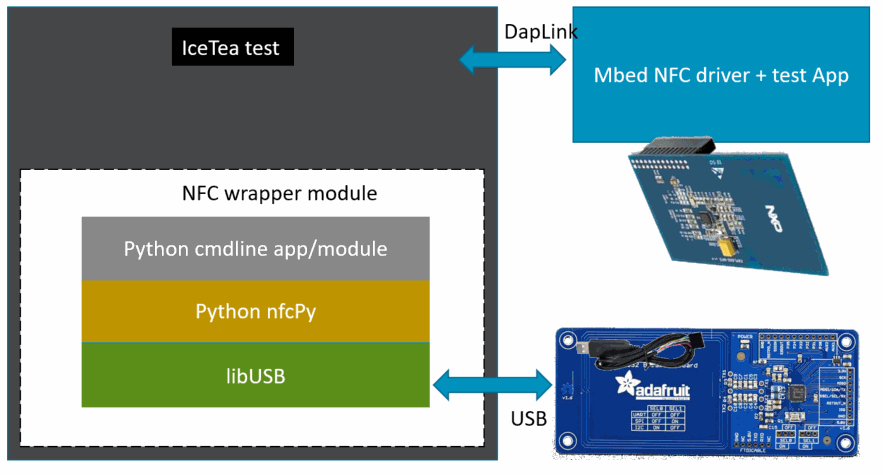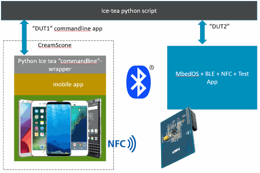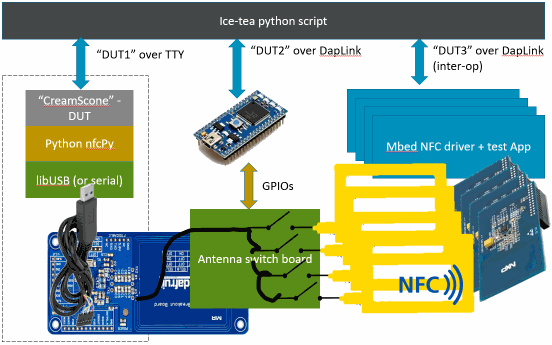 In order to mitigate the costs associated with system testing, use existing frameworks or parts and make it easy to test each individually. The nfcpy Python library is used as the core of the CreamScone component which uses a PN53* device SCL3711 usb reader over USB to read the mbed simulated tag. This library is used to drive host interactions because it is portable (windows/GNULinux.) Remote NFC interactions will raise events in the mbed application. Connection and read/write events which get handled in user application on the target get wired up to asynchronously return responses and the data values (NDEF messages) to the ice tea framework. These events and data are thus tested/checked in the code (python) running on host. The target test app wraps the API, allowing many new test-scenarios to be written purely in Python.